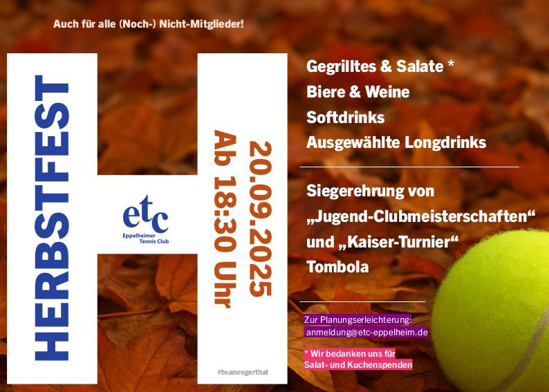 Am 20. September feiern wir unser Herbstfest – sportlich, gesellig und mit jeder Menge Spaß. Was euch erwartet: Aufstiegsspiel Mixed Aktive; Kaiser-Turnier für Erwachsene – offen für alle Spielstärken, ideal auch für unsere Neumitglieder; Jugend-Clubmeisterschaften parallel auf den Plätzen; ab 18.30 Uhr Herbstfest in der Pergola mit Tombola, Grillabend und Siegerehrung der Clubmeisterschaften. Kommt vorbei, spielt mit oder feuert an – und lasst uns danach gemeinsam feiern. Wir freuen uns auf einen großartigen Tag mit euch. Anmeldung zur besseren Planung bitte per E-Mail an: anmeldung@etc-eppelheim.de